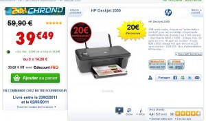 En effet , vendue 39.49 euros sur le site ( cliquez ici pour voir l’imprimante ) , elle fait l’objet de la même offre de remboursement différée de 20 euros de la part de Hp à condition de l’acheter avant le 28 fevrier :