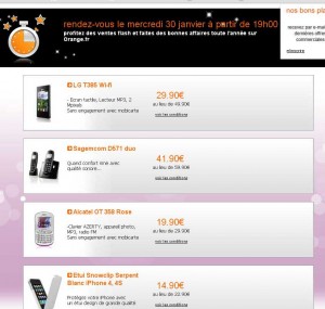 Nouvelle vente flash chez orange du 30 janvier au 1er fevrier avec de nouveau des mobiles en formules prépayées sans engagement à prix reduits .. Mobiles livrés avec une puce orange contenant 5 euros de communication