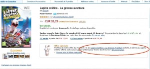 Vous devez achetez le jeu LAPINS CRETINS LA GROSSE AVENTURE à 26 euros 29 puis choisir en cadeau au choix soit « The Lapins Cretins Show » , soit » Rayman contre les lapins encore plus cretins » soit « Rayman contre les lapins cretins »