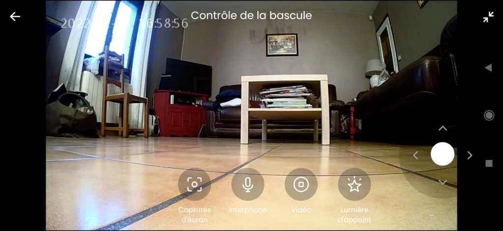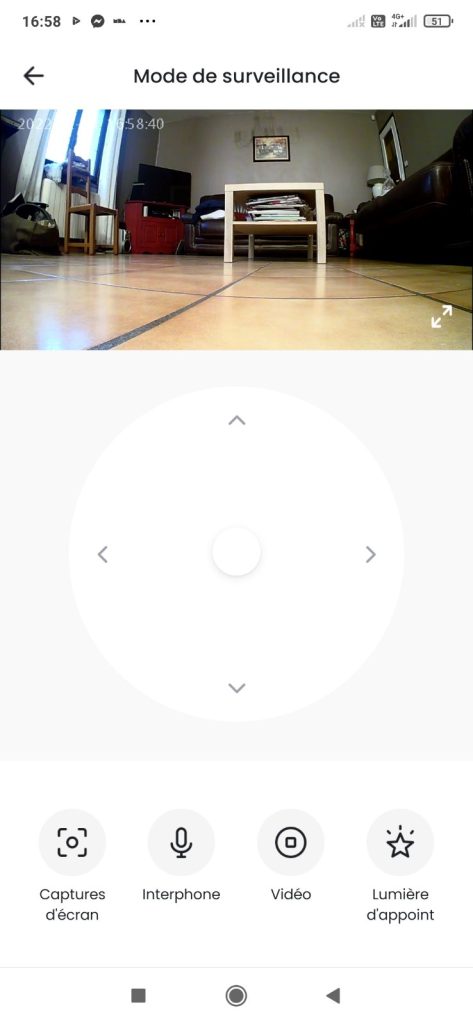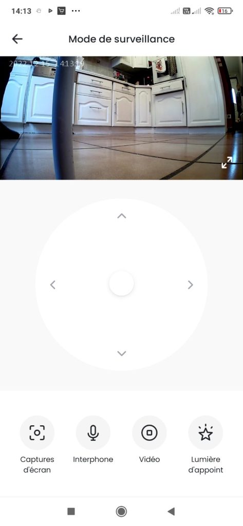Un nouvel écran apparait alors dans lequel on voit donc la vision de la caméra , un joystick virtuel pour diriger l’aspirateur et 4 options ( capture ecran , interphone, video et lumiere)..