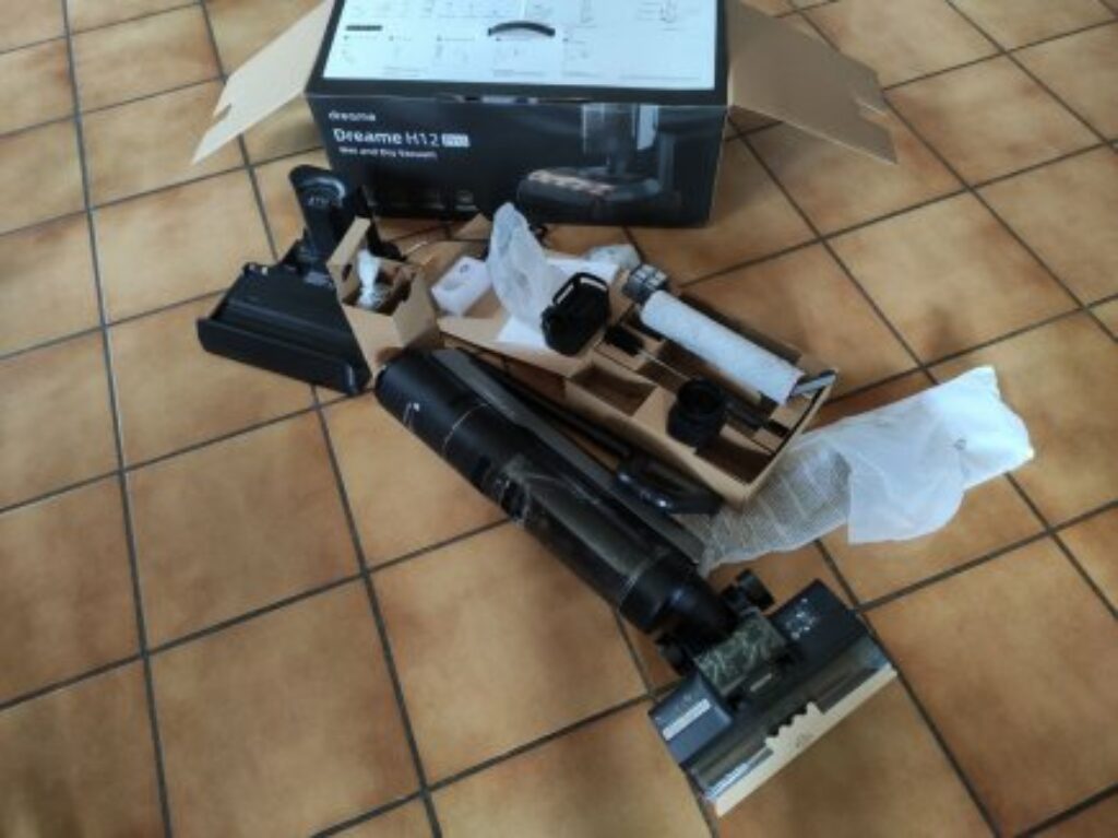 Dans le carton du Dreame H12 Pro , on trouve donc la base de chargement , l’appareil en lui meme en deux parties ( il faut emboiter le manche) , des accessoires de remplacements (un filtre et un rouleau ) et aussi un petit flacon de liquide de nettoyage (liquide qui s’utilise en en mettant 10cl dans le reservoir d’eau). Il y a egalement une brossette qui a vocation à aider à sortir les saletés du recuperateur d’eau sale ..