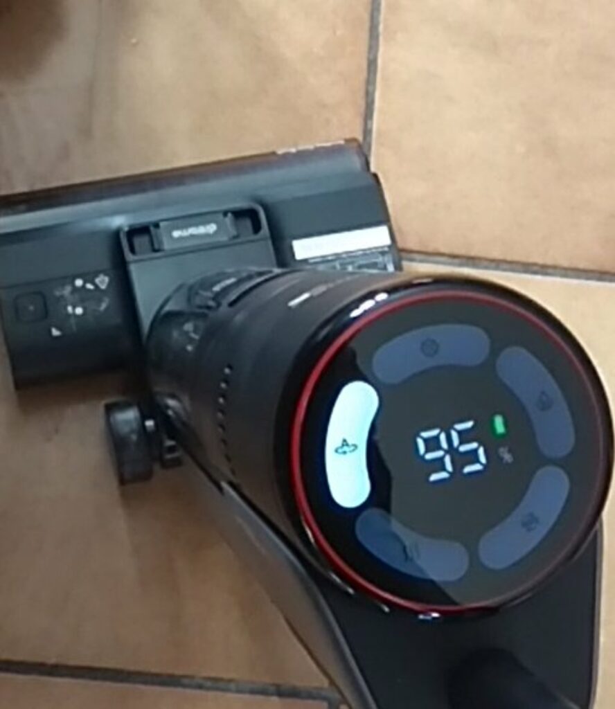 Sur l’écran de l’appareil , l’autonomie restante est affichée en gros et on voit celle ci rapidement diminuer .. Effectivement comme annoncée , l’appareil à une autonomie qui doit dépasser un peu les 30mn .. En général cela ne doit pas trop poser de pb , mais cela peut etre juste parfois si on toute une grande maison ou appartement à faire surtout si il y a des parties sur lesquelles il faut insister …