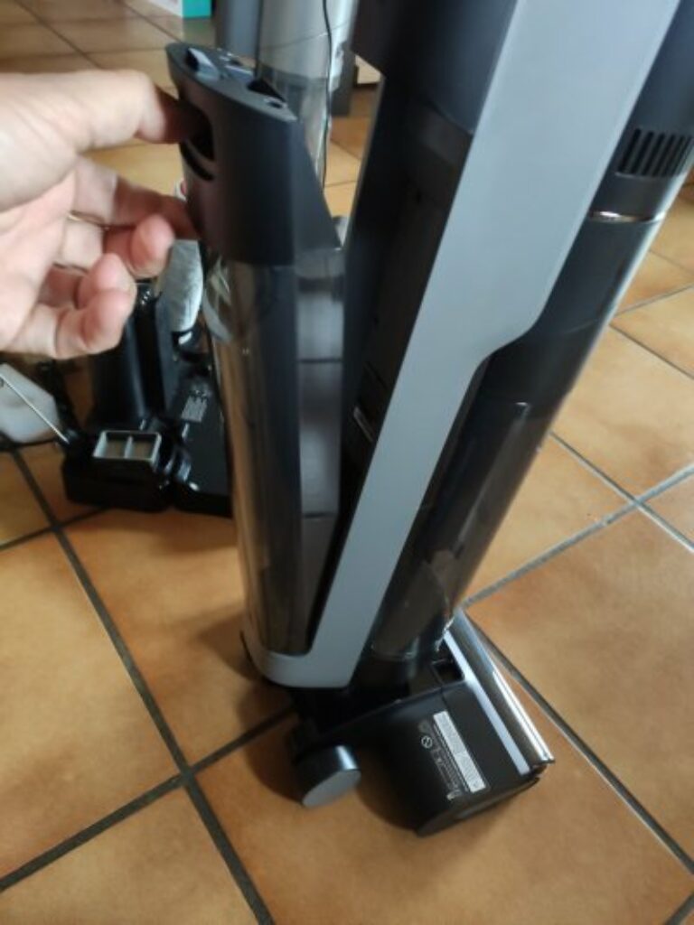 L’autonettoyage se fait donc sur la base de chargement .. Une fois le dreame d10 plus sur son support , on appui sur le bouton sur le haut du manche pour lancer l’opération ..