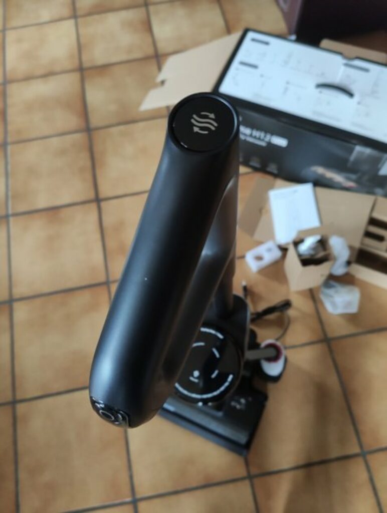 Il suffit ensuite de basculer le manche pour qu’il se mette en fonction et qu’il avance le rouleau étant motorisé… L’appareil va donc laver et aspirer, l’eau sale et les poussieres aspirées se retrouveront dans le bac à eau sale.
