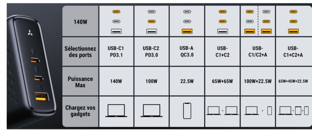 Il offre 3 ports de sorties : 2 ports type C et un port usb -a classique .. Ces 3 ports offrent une puissance de sortie maximale differentes .. Le 1er port type C peut delivrer jusqu’à 140 watts s’il est utilisé seul , le deuxieme 100 watts et le port usb-a jusqu’à 22.5 watts ..