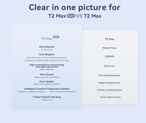 Les améliorations du Wanbo T2 MAX New par rapport à la version précédente : Autofocus automatique, grosse augmentation de la luminosité à 450 Ansi Lumens contre 250 , meilleur son , plus silencieux