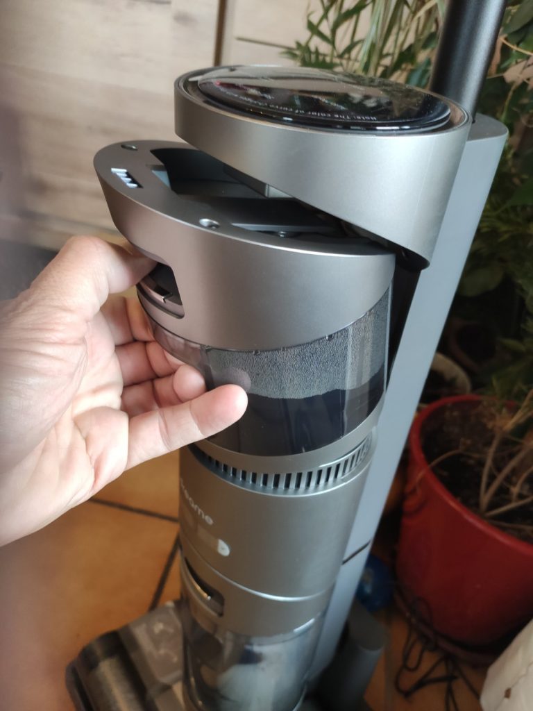 Une fois le nettoyage terminée , on repose l’appareil sur sa station de charge et on a la possibilité de lancer un autonettoyage en appuyant sur le bouton au sommet de la poignée … Cela va procéder au lavage de la brosse en lui envoyant de l’eau et en aspirant … Il pourra etre nécessaire de remettre de l’eau dans le reservoir ou de vider le collecteur d’eau sale pour que la fonction puisse s’effectuer completement…