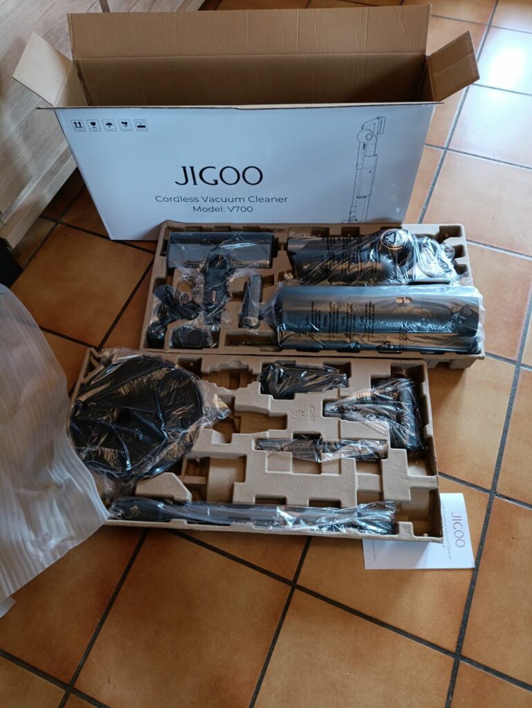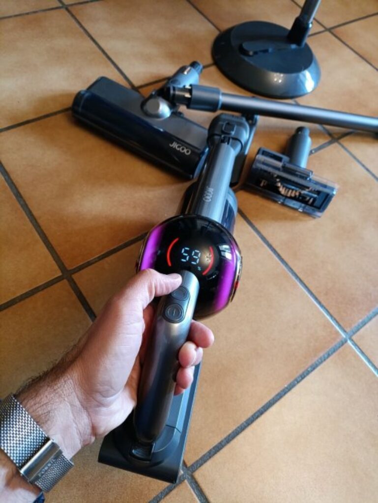 Le Jigoo V700 est un aspirateur sans fil balai ou à main qui se distingue donc des autres par sa station de vidage(à sac) , sa puissance annoncée de 33Kpa mais aussi son autonomie qui pourrait aller jusqu’à pres d’une heure ..