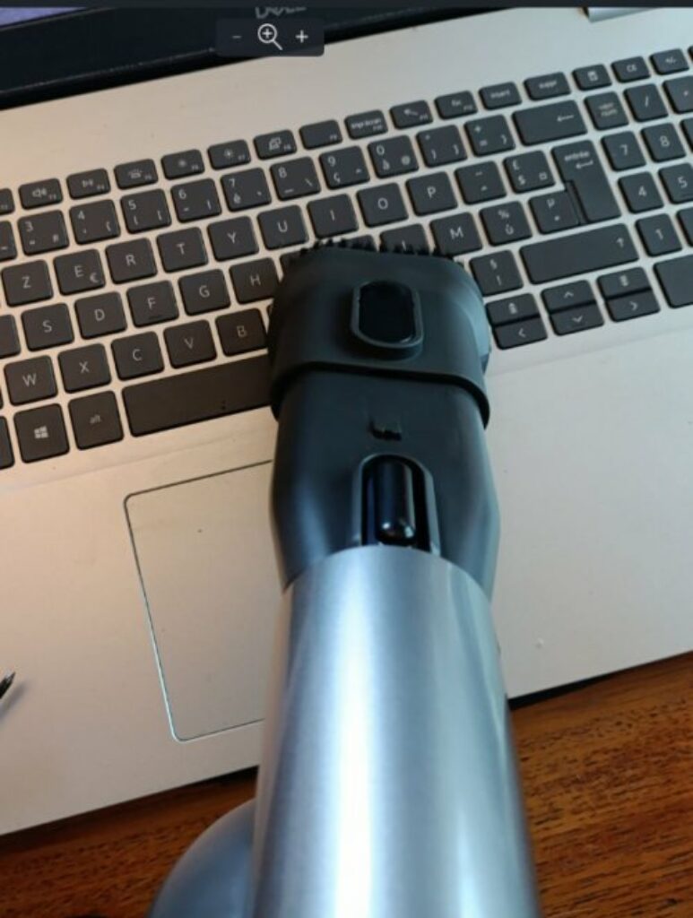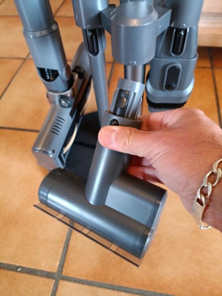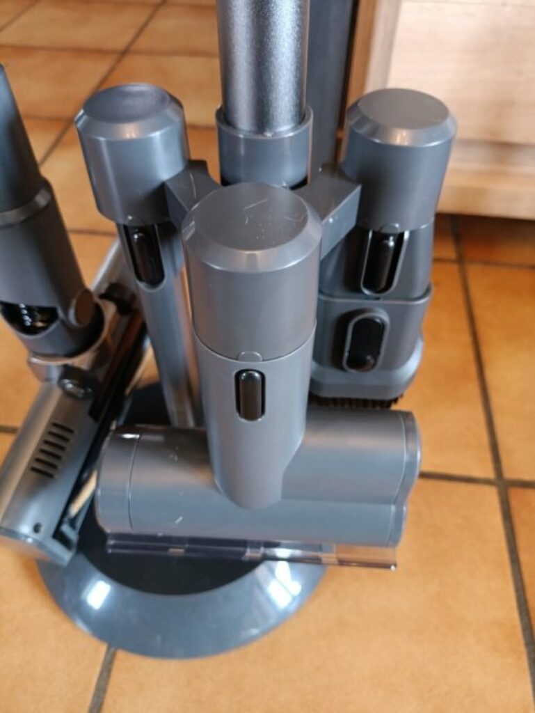 Ce qui est appreciable aussi c’est que tous les embouts se clipsent dans les supports au niveau du pied et tiennent bien .. on peut donc meme deplacer l’ensemble de l’aspirateur + base sans que rien ne tombe au sol .. A noter que je ne l’avais pas remarque tout de suite , mais il y a un guide au niveau de chaque emplacement du support pour savoir comment bien mettre chaque embout , en alignant son bouton avec le guide ..