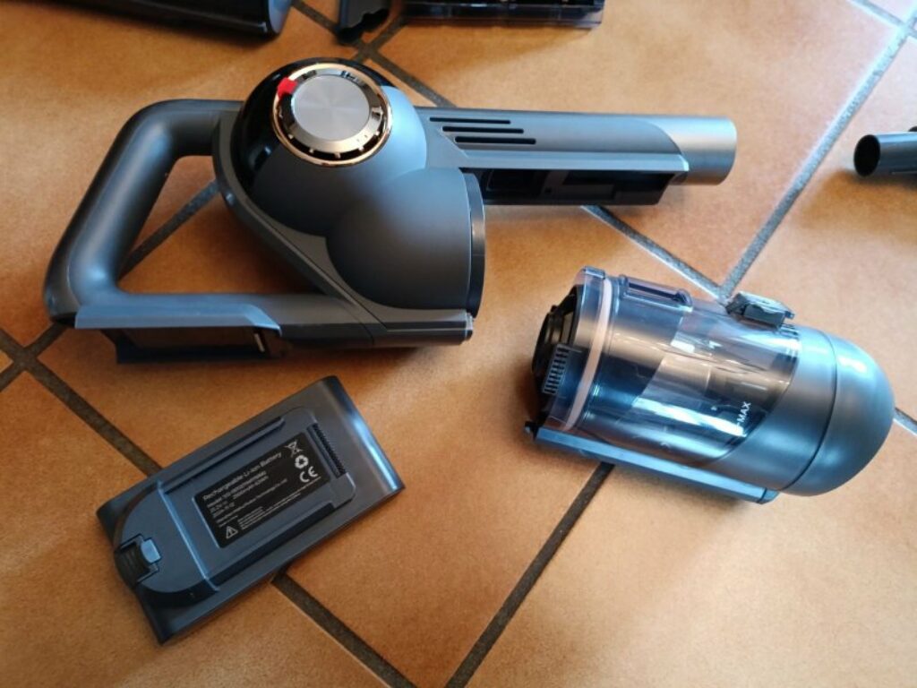 La partie principale de l’aspirateur composée de 3 élements : la partie aspiration avec le moteur , le recuperateur à poussiere , la batterie à placer dessous ..