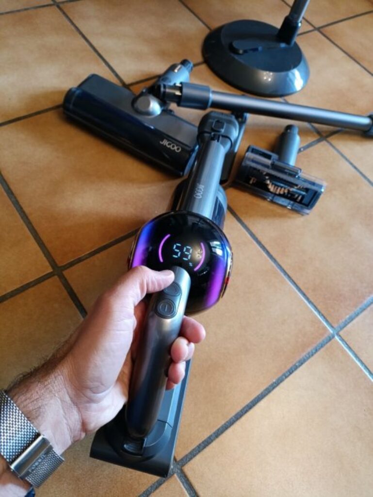 La partie principale de l’aspirateur dispose d’un écran d’affichage en couleur et de deux boutons de commandes … Un bouton de mise en marche et un bouton permettant de basculer entre les 3 modes d’aspiration..