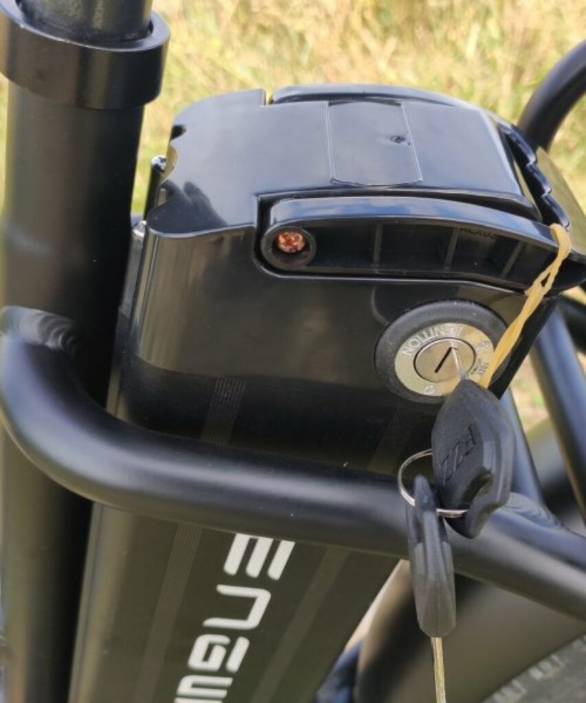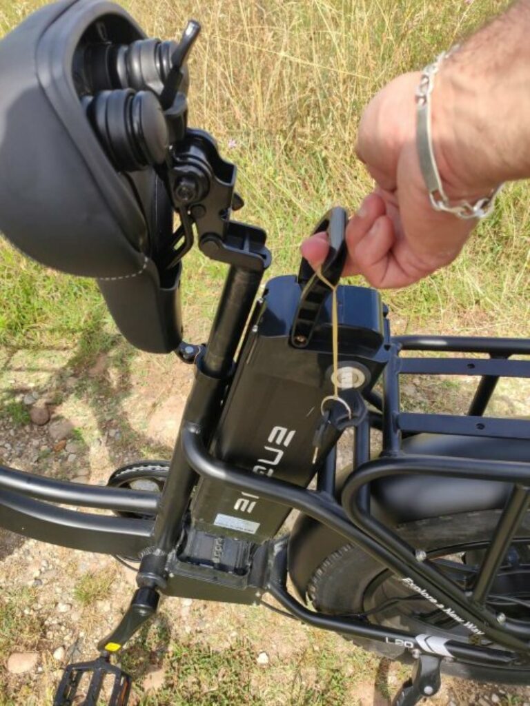 Dans les points positifs on remarque aussi que la clé au niveau de la batterie ne sert pas qu’à bloquer celle ci , mais est aussi une clé de contact … Il faut en effet la placer sur « ignition » pour pouvoir allumer l’écran de controle … Pratique pour limiter le vol …En tout cas , le voleur ne pourra partir qu’à la force de ses jambes et ne pourra pas utiliser le moteur s’il n’a pas la clé ..