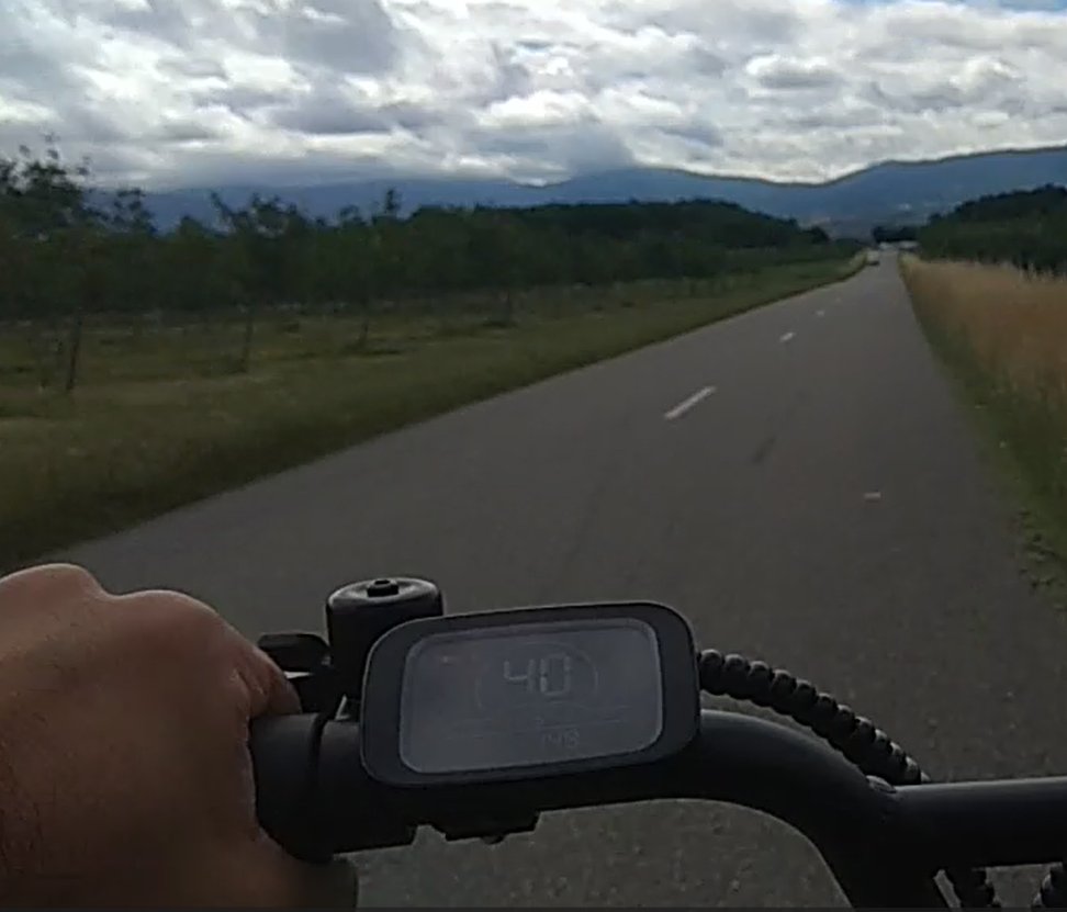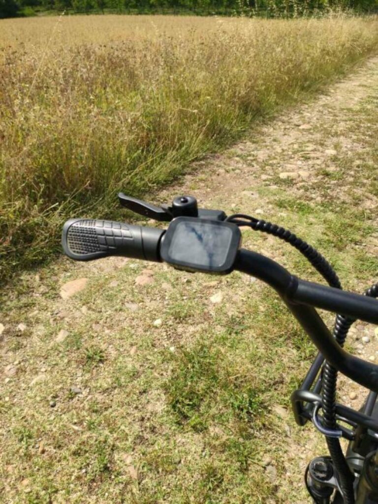 Une remarque: contrairement à d’autres vélos electrique – quand elle est activée bien sur – la poignée d’accélerateur ne tient pas compte du niveau d’assistance … C’est à dire que quelque soit le niveau d’assistance défini sur l’ecran de controle , si par exemple la vitesse maxi est à 40kms/h , si on est sur du plat et qu’on pousse l’accelerateur à fond .. et bien on ira à 40kms/h …