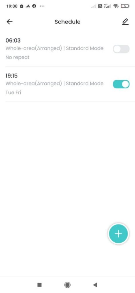 La fonction de programmation permet de son coté de programmer un nettoyage en precisant l’heure de depart , la puissance d’aspiration et le mode de nettoyage … il est aussi possible de préciser des jours de travail ( chose que je n’avais pas vu initialement et qui se precise en allant dans l’option « repeat » de l’écran de parametrage de la programmation.