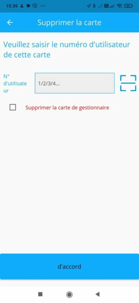 Avec l’application, il est possible d’ajouter les cartes rfid en precisant une plage de validité .. on saisira la plage de validité et on scannera le code barre de la carte avec l’application pour l’ajouter .