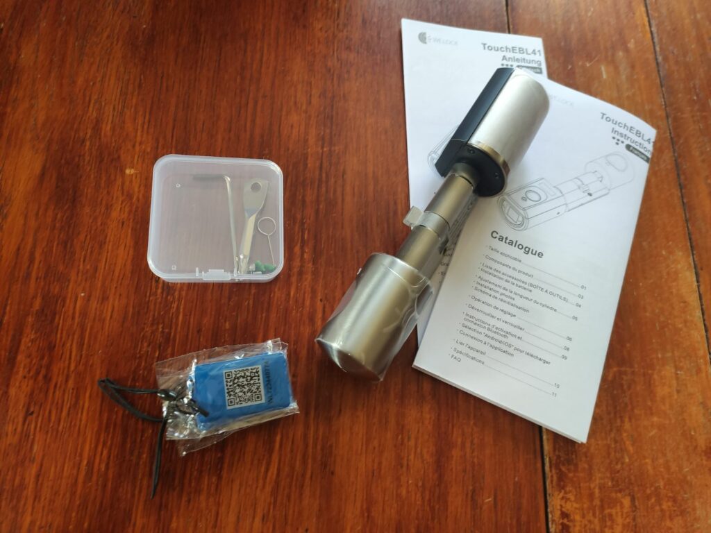 Dans la boite , on trouve donc le Cylindre Welock Touch41 , des documentations dans plusieurs langues , dont une en français , 3 cartes rfid , et une petite boite avec des accessoires ( clé à pan et vis )