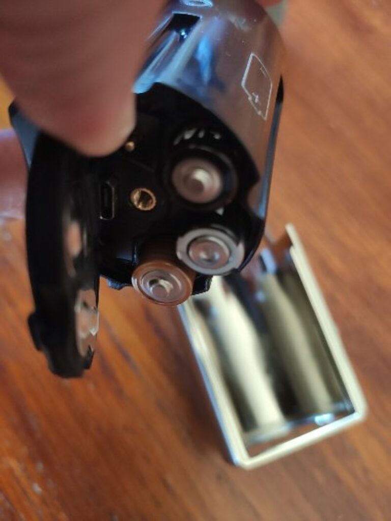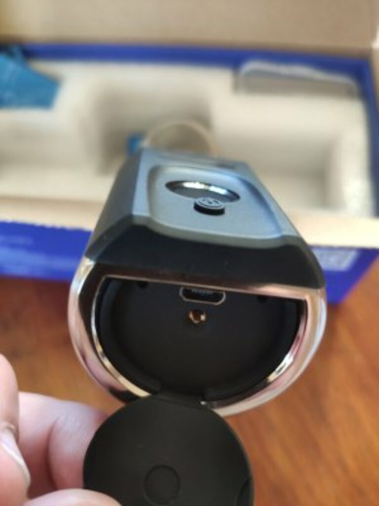 La premiere chose à faire va donc consister à mettre 3 piles AAA dans le cylindre .. Pour cela il va falloir – du coté du boitier exterieur – enlever la petite vis sur le coté pour retirer le cache et pouvoir ouvrir le couvercle. Une fois cela fait , on refermera donc l’ensemble .