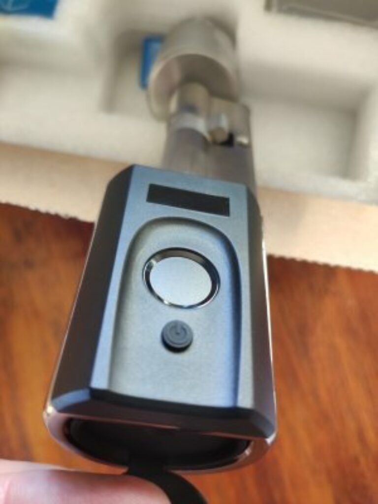 Au niveau de l’aspect du bloc cylindre , on peut donc voir que d’un coté , la poignée interieure , fait tout le temps tourner le verrou .. Pour la partie exterieure la poignée se presente sous la forme d’un boitier , possedant sur le dessus: un petit bouton poussoir d’activation, un capteur d’empreintes et un petit ecran..
