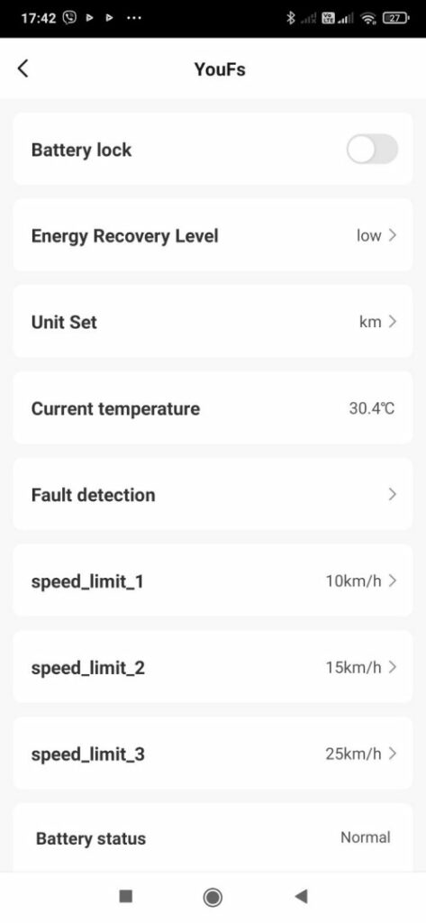 Comme on a vu avec l’application il est possible de modifier les vitesses des differents paliers ce qui est pratique car la trottinette dispose d’une fonction vitesse de croisiere .. Si on maintient l’accélérateur à fond durant 10 secondes , cela va activer le mode vitesse de croisiere sur la vitesse maximale du palier donc dans lequel on se trouve … On pourra donc lacher l’accelerateur et la trottinette avancera à cette vitesse .. Il suffit de rappuyer sur l’accelerateur ou sur le frein pour desactiver le mode vitesse de croisière.