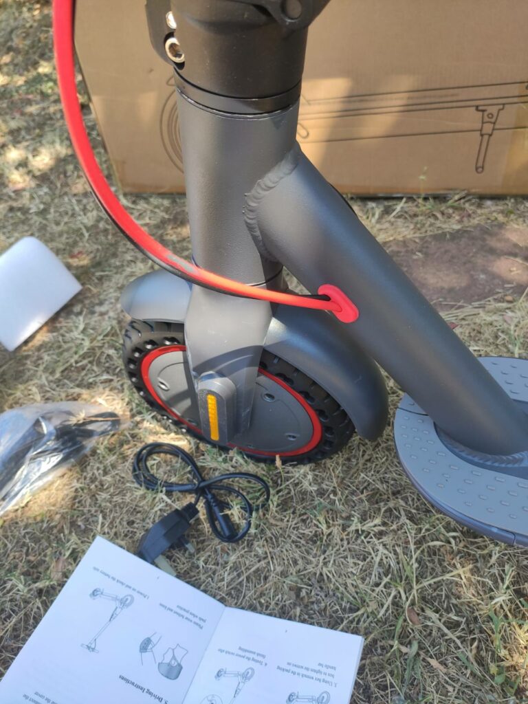 La trottinette est livrée dans un carton pas tres grand … A l’interieur on trouve donc la trottinette qui est pliée , une documentation en anglais , un chargeur , un petit sachet de vis avec une clé à pan …