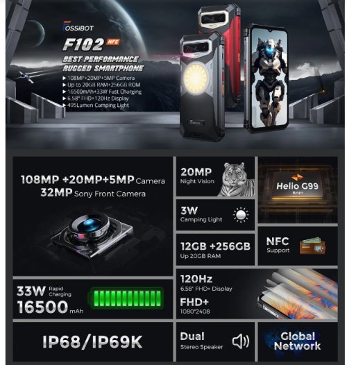 Le Fossibot F102 est donc un smartphone sous Android 13 qui annonce les caracteristiques suivantes : un écran de 6.58 pouces IPS avec rafraichissement à 120hz avec une résolution FHD+ de 1080*2408 pixels , un processeur Mediatek helio 99 , 12go de mémoire vive extensible à 20Go en utilisant une partie de l’espace de stockage , 256go d’espace de stockage, triple capteur photo arriere 108+20+5MP dont un capteur à vision nocturne sony , un capteur frontal sony de 32Mp ..