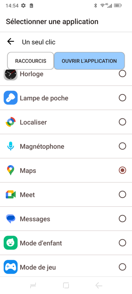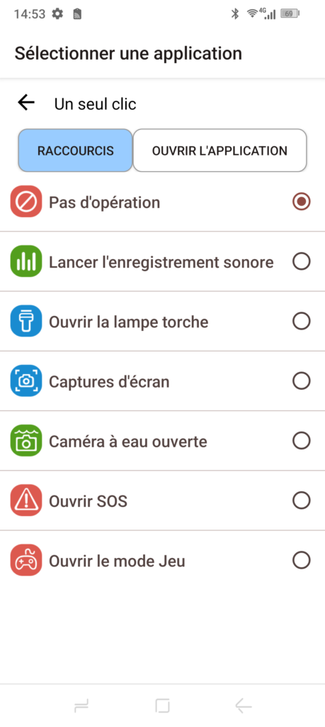 Il est possible soit de définir un raccourci predefini (par exemple capture d’ecran , ouvrir sos , ouvrir le mode jeu , lancer l’enregistreur sonore … ) ou d’appeler une application…