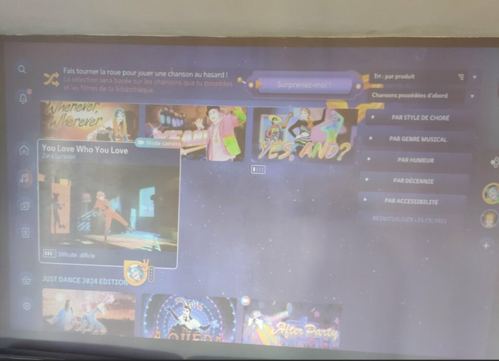 A noter que j’utilise donc le video projecteur posé sur une table de salon et incliné tant bien que mal avec des revues posées dessous pour projeter sur un mur uni de couleur gris anthracite et pas blanc ..