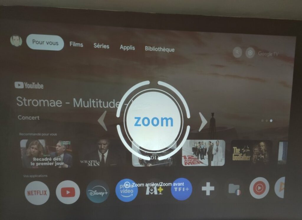 Option interessante , il est possible de reduire la taille de l’image , en allant dans la fonction zoom dans les parametres .. Pratique si on ne peut mettre le video projecteur qu’à une certaine distance , mais que la surface sur laquelle on désire projeter est plus petite que celle créée par défaut ..