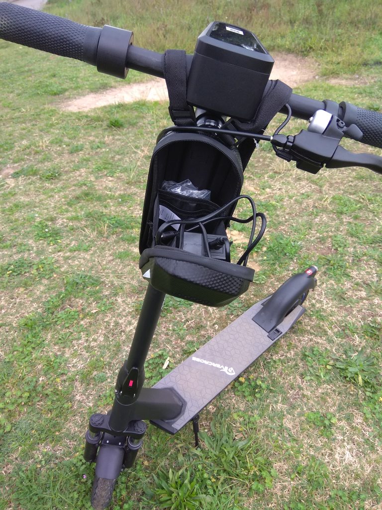 Au deballage on trouve donc la trottinette , son chargeur avec prise us et prise ue , une documentation , une pochette de rangement qui peut se placer à l’avant de la trottinette , et quand laquelle on peut mettre le chargeur et son cable , tout en ayant encore un peu de place pour y mettre autre chose ..