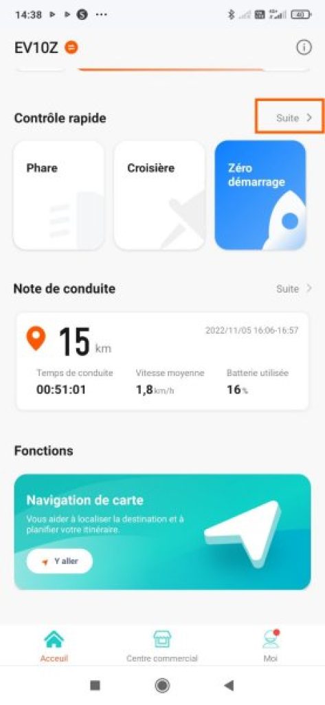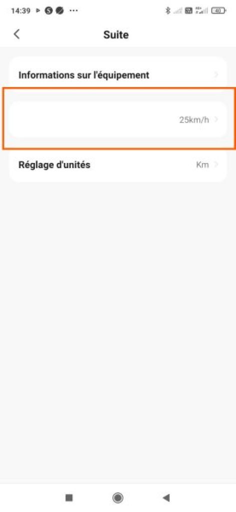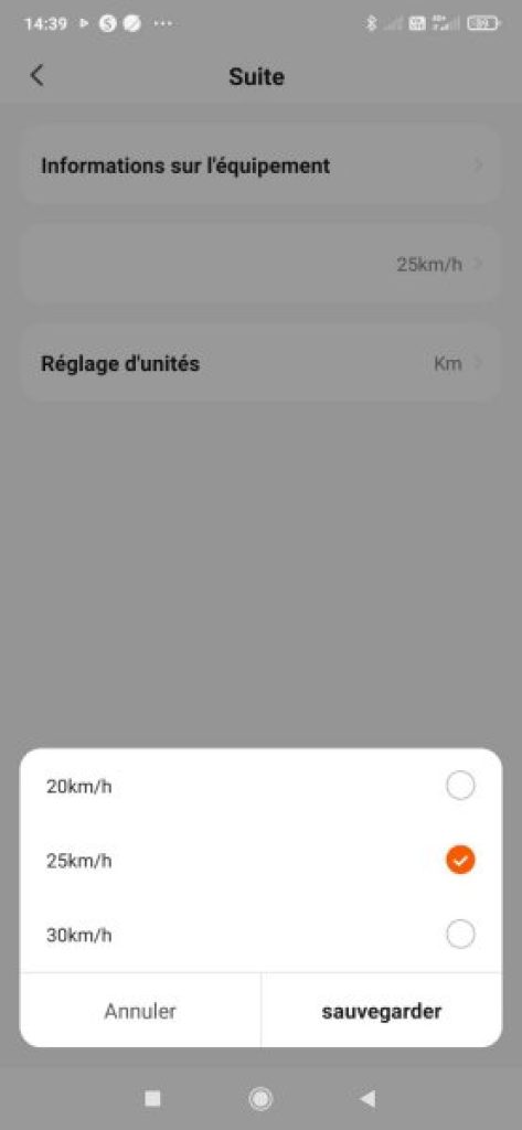 Puis aller dans l’application et appuyer sur « suite » en face de « controle rapide » … Dans le nouvel ecran on verra donc apparaitre une entrée avec la vitesse et en allant la dedans on pourra choisir la vitesse maximale entre 3 choix : 20 , 25 ou 30 kms/h..