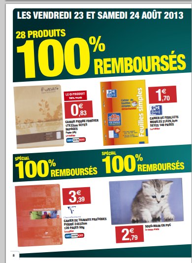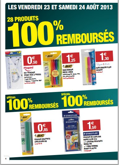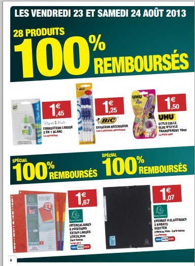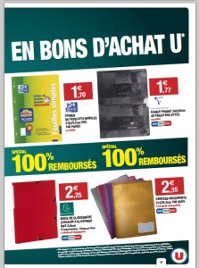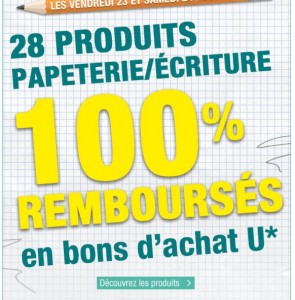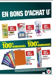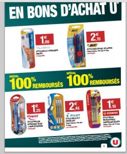 La meilleure affaire pour la rentrée scolaire se trouve dans les magasins super u et hyper u les 23 et 24 aout 2013 … Comme en 2012, les magasins proposent des fournitures scolaires entierement remboursées en bon d’achat .. Il y a 28 articles concernés : crayons , stylo , effaceurs , chemise, gomme, paire de ciseaux , pinceaux, cahiers avec que des produits de marques: bic, clairefontaine, oxford, seye, maped, stabilo, pilot ,
