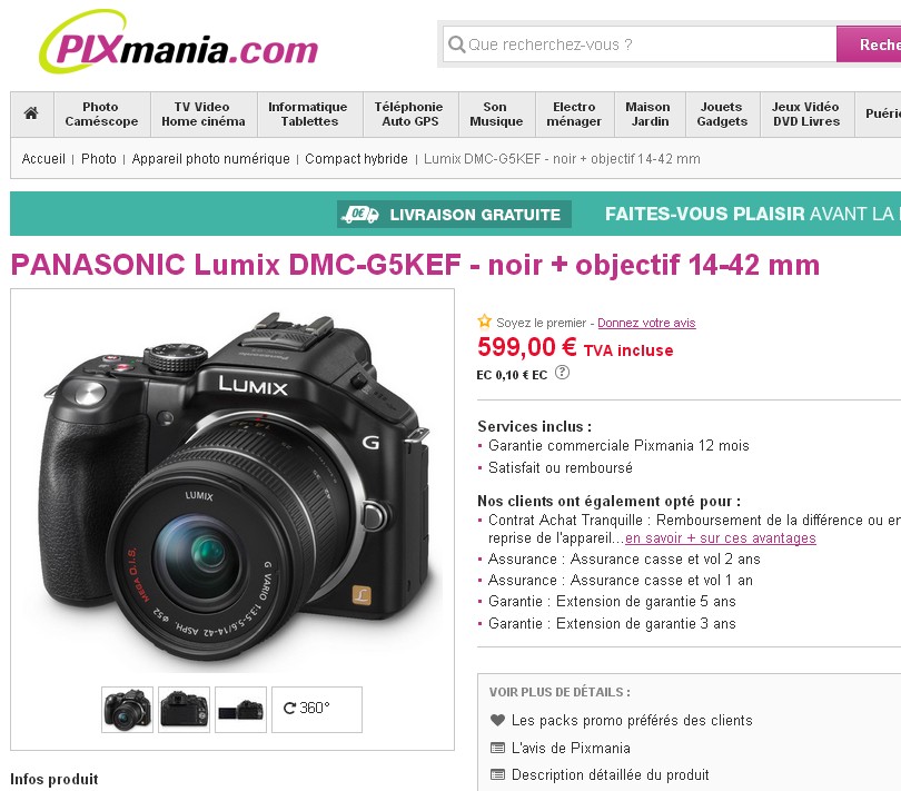 Appareil Photo hybride Panasonic lumix G5K obj 14-42 à 273 euros