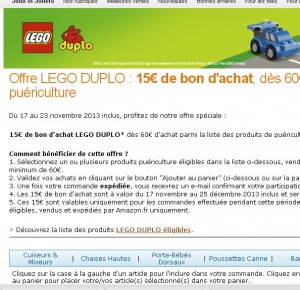 une offre assez originale sur amazon du 17 au 23 novembre 2013 .. Pour l’achat de produits de puericulture pour au moins 60 euros on recoit un bon d’achat de 15 euros à utiliser pour l’achat de jouets lego duplo ..