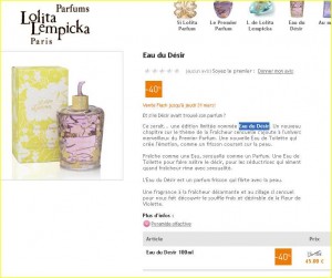 Si vous aimez la marque Lolita Lempicka , vous pouvez faire une bonne affaire si vous désirez acheter son dernier parfum « Eau du Désir » . En effet , alors que le flacon 100ml est vendu 74 euros chez Séphora, 59 euros chez Marionaud , il se trouve en vente flash chez Nocibé à 45 euros seulement jusqu’au 31 mars .