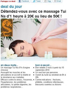 Encore un bon plan massage , et cette fois ci sur Bordeaux : KgbDeals propose en effet pour 20 euros , un bon donnant droit à 1 heure de massage Tui Na chez Taozen 69 rue Lagrange 33000 Bordeaux .