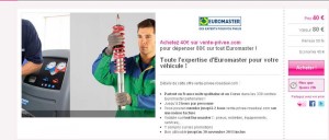 Sur le site vente privee , est vendu pour 40 euros un bon d’achat d’une valeur de 80 euros valable dans les centres auto euromaster .. Ce bon est valable sur l’ensemble des services et produits vendus chez euromaster ..