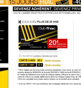 Si vous n’êtes pas adherent fnac, sachez que la carte adherent 3 ans revient actuellement à 10 euros .. Vendue à 30 euros pour les plus de 26 ans, elle fait l’objet de 20€ de credit en bon d’achat ..