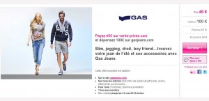 Encore une offre bon d’achats à prix réduits sur venteprivee : avec cette fois ci pour 40 euros un bon d’achats d’une valeur de 100 à utiliser sur la boutique en ligne GAS JEANS sur laquelle on trouve donc Jeans, tee shirt, pull , chemises mais aussi chaussures et accessoires ..