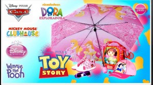On y trouve ainsi par exemple à 6 euros des sandales disney princess, cars, dora .. des tongs à 2 euros , des baskets dora , toy story à 11 euros , des parapluies à 4 euros, des montres dora à 6 euros ..