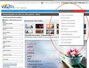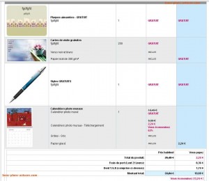 Ensuite avant de confirmer sa commande, il est possible d’ajouter un exemplaire de plusieurs articles gratuits ( accessibles par le menu en haut « produits gratuits » ) .. En ajoutant tous ces articles gratuits ( 250 cartes de visites, 1 stylos, 1 plaque aimantée, 1 autocollant pour voiture , 1 tampon encreur ) et en ajoutant les frais de port pour une livraison sous 3 semaines , cela fait un total à payer de 10.60 euros ..