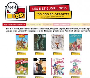 Si vous aimez les bandes dessinées , bon plan les 5 et 6 avril dans des librairies en France .. En effet plusieurs editeurs (casterman, dargaud, dupuis, lombard… ) offrent 100 000 exemplaires de 8 albums différents gratuitement .. Il suffit d’aller retirer un exemplaire dans une des librairies participantes