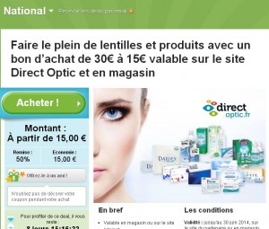 Si vous portez des lentilles de contact, il y a un « deal » qui peut vous interesser sur le site groupon : pour 15 euros on peut acheter un bon d’achat de 30 à utiliser chez direct optic .. Dans l’un des magasins de l’enseigne ou sur le site web ..