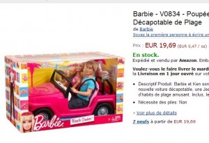 Pour les petites filles qui aiment les poupées barbie, il semble y avoir un tres bon prix sur amazon, pour un pack regroupant deux poupées (Barbie + Ken ) et une voiture .. L’ensemble etant vendu 19.69 euros livraison inclus