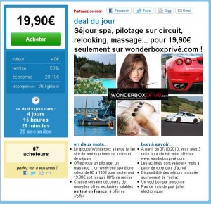 Grace à Kgbdeal il est possible d’economiser plus de 20 euros sur l’achat d’un coffret . En effet jusqu’au 5 octobre , il est possible d’acheter pour 19 euro 90 un bon d’achat de 40 euros valable sur le site wonderboxprive pour l’achat de n’importe quel coffret cadeau.