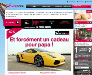 Super bon plan si vous avez envie d’offrir un coffret cadeau pour la fete des peres : le site d’achats groupées « Wonderdeal » qui fait partie du groupe wonderbox propose justement un bon d’achat valable sur le site wonderbox : 9 euros 90 le bon d’achat d’une valeur de 30 euros ..