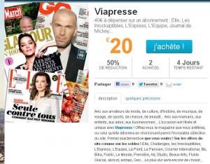 Mais cela peut l’être encore plus en profitant du « deal » present sur living social et qui propose pour 20 euros un bon d’achat de 40 valable sur le site viapresse.