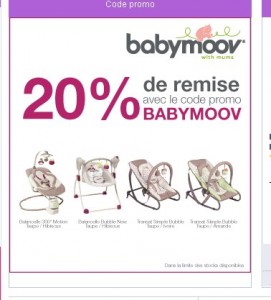 Sur cdiscount jusqu’au 15 mai, il y a 20 pourcent de remise immédiate sur des transats et balancelles Babymoov .. Il faut pour cela saisir le code promo « BABYMOOV » dans son panier … Une offre qui peut donc etre interessante si vous avez un enfant en bas age ..