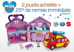 Encore une offre jouet qui peut etre interessante : sur amazon , pour l’achat de deux jouets en rapport avec l’univers disney , il y a 25% de remise en utilisant le code promo « JEDISNEY » ..