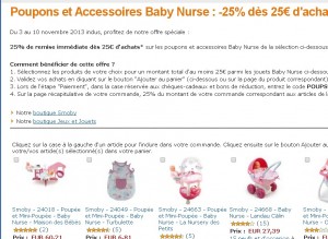 Encore une offre jouets sur amazon cette fois ci plutot à destination des petites filles .. Avec 25% de remise immédiate pour 25 euros d’achat en jouets Smoby baby nurse ..