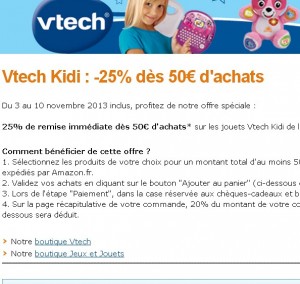 Encore une offre jouets interessante en prévision de noel sur amazon : sur le site jusqu’au 10 novembre 2013 il y a en effet 25% de remise immédiate sur les jouets de la magamme Kidi de vtech .. A condition d’en acheter pour au moins 50 euros ..